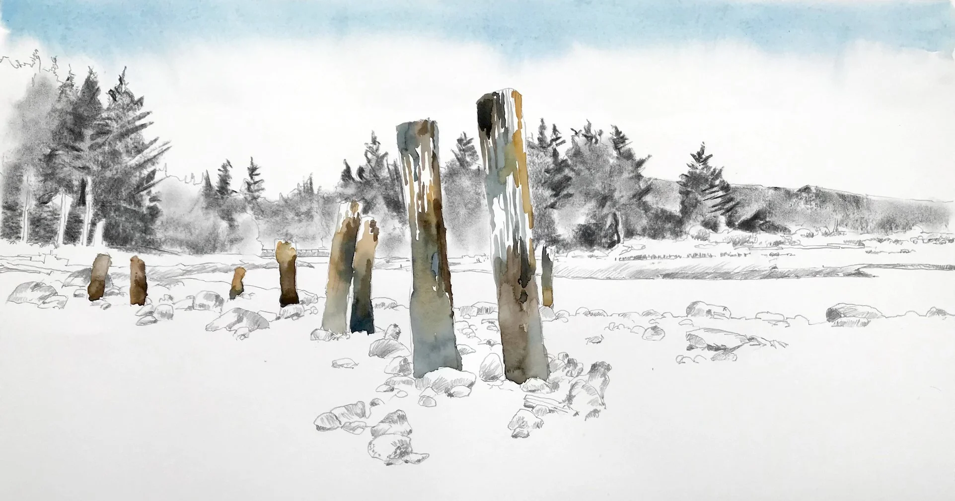 Nine GhostsRoberts Creek beach, BC. 14” x 30”, watercolour, graphite and charcoal. Created in studio. Inquire About this Work